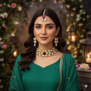 Elevate your traditional style with this Turkish Imitate Pearl & Ruby-Tone Choker Set, crafted to reflect timeless elegance and luxury. Designed with high-quality imitate pearls and deep ruby-tone stones, this lightweight jewellery set is perfect for weddings, bridal wear, parties, and festive occasions.