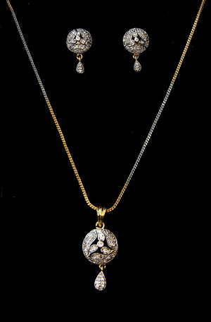 Elevate your everyday elegance with this exquisite Dual-Tone Locket Set. Featuring a unique circular pendant with a silver-toned floral motif encrusted with shimmering cubic crystals, this set is beautifully balanced by a classic golden chain. The matching drop earrings mirror the intricate design, creating a cohesive look that transitions perfectly from desk to dinner.
